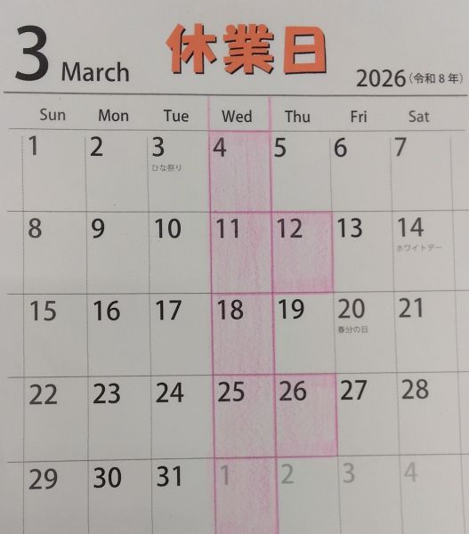 3月の休業日のお知らせです。